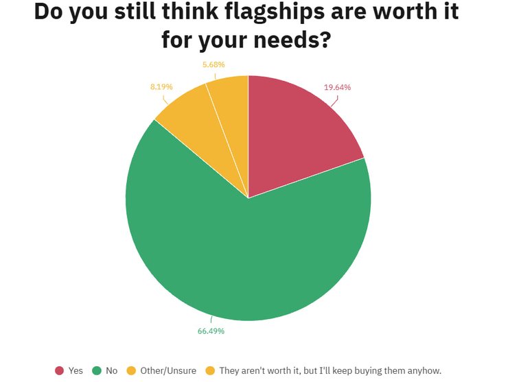 Лише 19,64% читачів віддали перевагу флагманським моделям. Серед них знайшлися ті, хто оновлює свій топовий пристрій раз на три-чотири роки, а також ті, хто скаржиться на повільну роботу та неплавність інтерфейсу в бюджетніших альтернативах.
