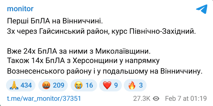 Моніторингові канали повідомляли про значну кількість БпЛА, що прямували на Вінниччину.