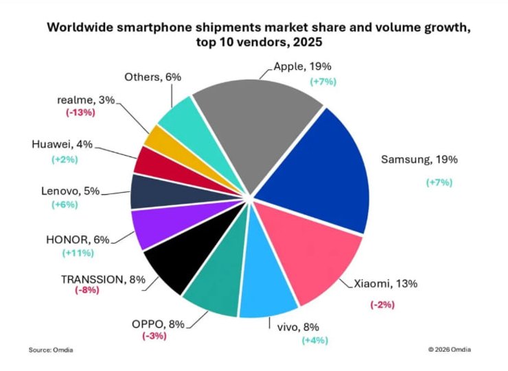 Згідно з останніми даними аналітичної компанії Omdia, постачання смартфонів Honor збільшилися на вражаючі 11% за підсумками 2025 року. Це найкращий показник серед усіх брендів на ринку.